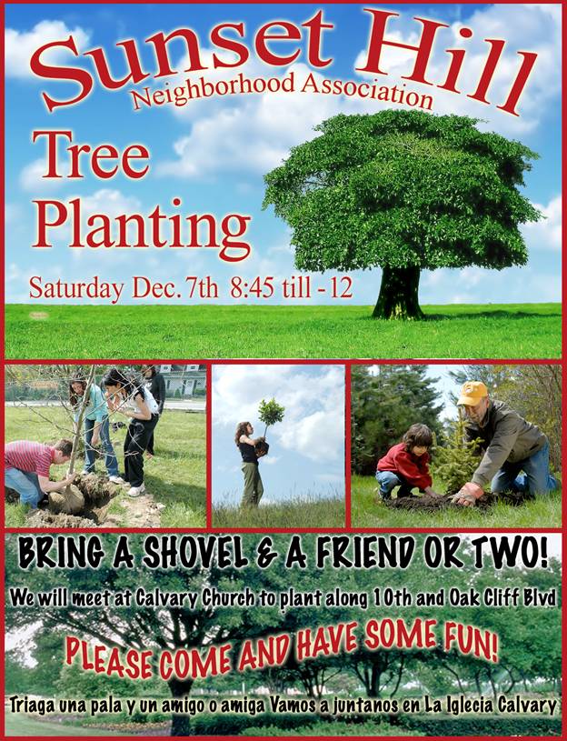 7 * Sunset Hills PlantingSunset Hills Planting Time: 8:45 am Calvary Church 10th and Oak Cliff Blvd 8:45 - Noon (click here for poster) |